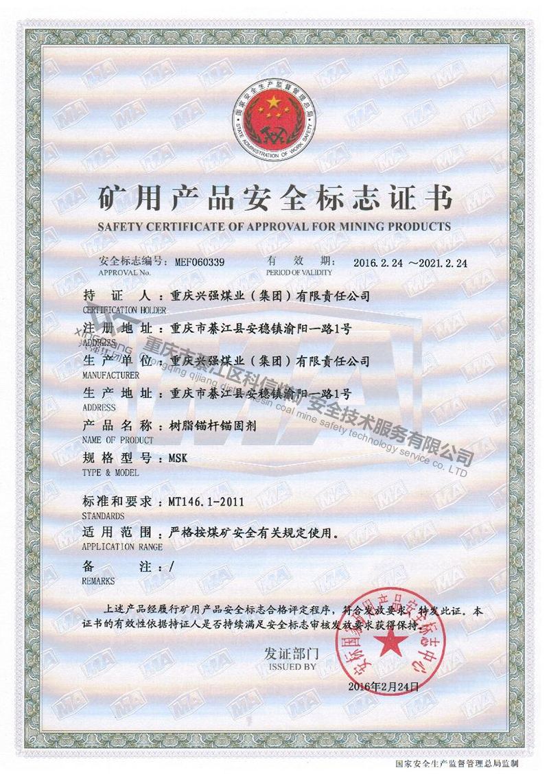 矿用产品安全标志证书