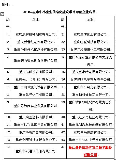 2011年10月公司被重庆市中小企业局认定为《重点示范企业》。
